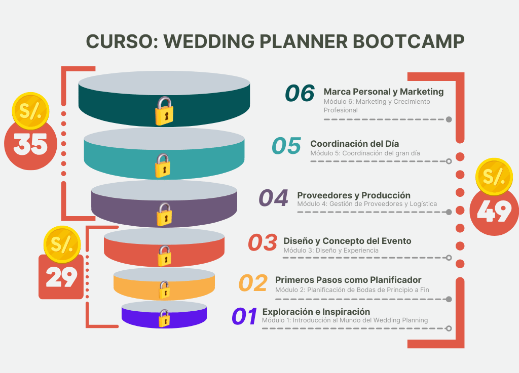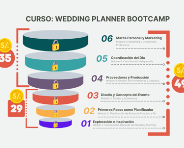 En este primer Bootcamp aprenderás lo básico sobre el mundo del Wedding Planning, gestionar proveedores, como coordinar el día de la boda, como diseñar y conceptualizar las bodas para tus clientes; por medio de actividades y explicaciones didácticas para asegurar el éxito de tus primeros pasos.